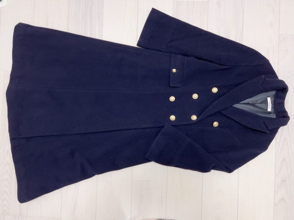 【備考】娘がおばあちゃんに買ってもらったコート。娘は細身体型の小柄でも154cmあるので袖丈を考えてSサイズにしたけど)モデルさんと同じ着用感になって大正解の長さでした♪購入時私の体重は55kg超えで腕はパツパツ、ボタンも閉まりませんでした(;^ω^)52kg台でなんとかボタンは閉まったけど中に何か着る余裕はなく腕周りもかなり窮屈。41kgの今は全体的にゆとりも出て腕周りも余裕がありニットも着れる着用感に。とても素敵なコートなのでたまにコーデで登場するかと思います。